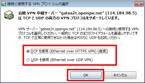 接続先の VPN Gate サーバーの種類によっては、上図のような選択画面が表示される場合があります。画面の指示に従って、TCP または UDP のいずれかを選択してください。